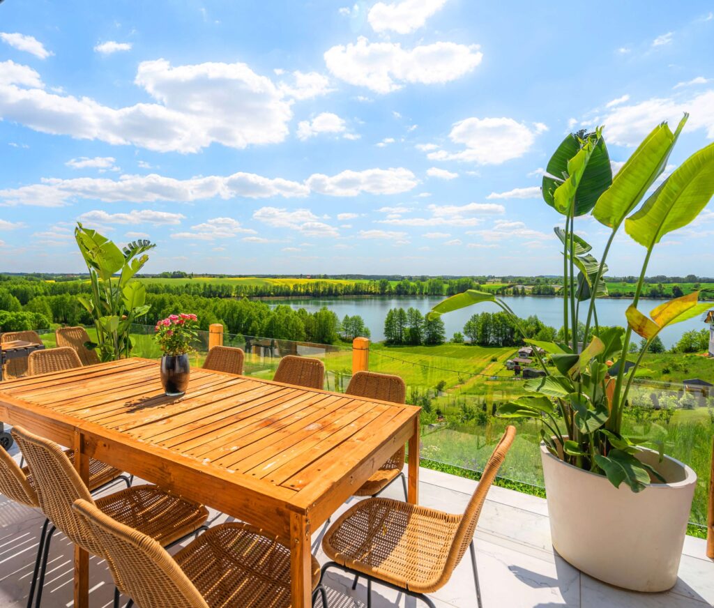 Taras z pięknym widokiem z góry na jezioro.